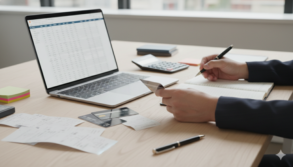 最も効率的なのは、ビジネス専用のクレジットカードを作り、仕事の支払いをすべてそのカードに集約することです。個人名義のカードであっても、それを「仕事用」と決めて他の支出を混ぜないようにするだけで、管理は劇的に楽になります。