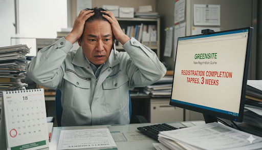 グリーンサイトの登録手続きは、申し込みから利用開始まで約3週間かかります。もし明日から現場に入場しなければならない場合、今すぐ元請けに相談し、一時的な「代行登録」を依頼する必要があるかもしれません。