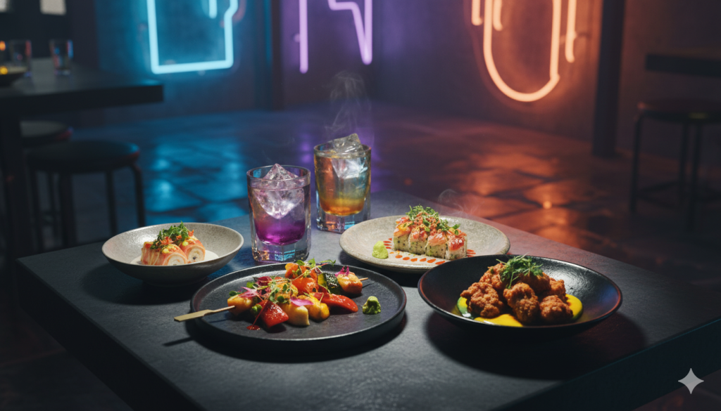 ネオ居酒屋の体験価値は、空間演出だけで完結しません。そこで提供されるメニューは、「美味しい」という伝統的な評価軸の前に、「驚き」「楽しさ」「共有したい」という感情を喚起するように緻密に設計されています。