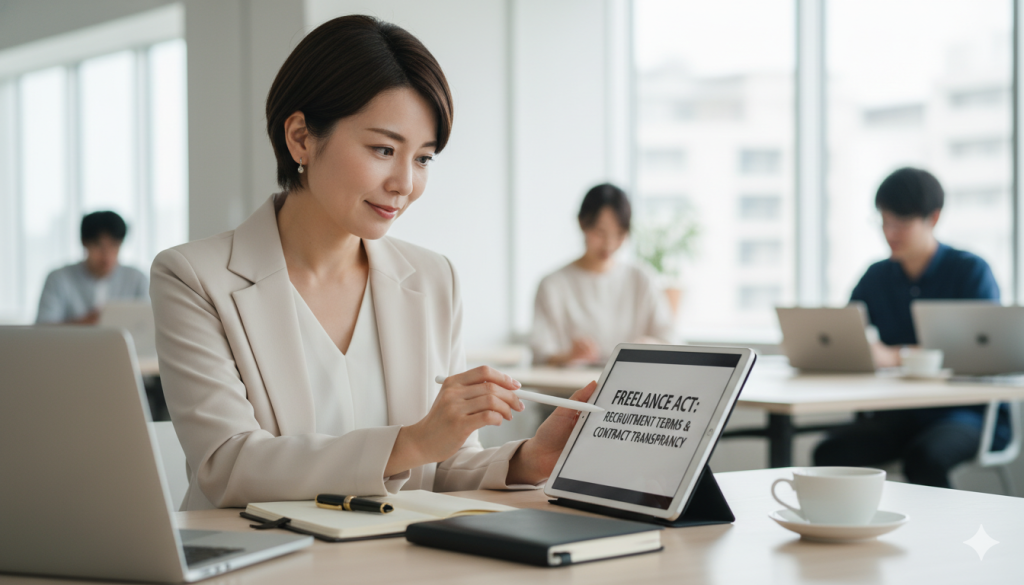 例えば、募集広告で「交通費全額支給」と記載しておきながら、実際の契約段階で「報酬に含む」と条件を変更し、フリーランスが断りにくい状況を利用して契約を締結させる行為は、新法における「不当な不利益を与える行為」に該当する恐れがあります。募集から契約に至るまで、一貫した透明性が求められています。