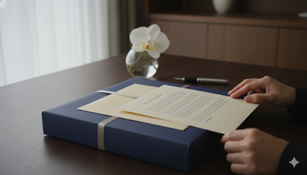 記念品の箱に送付状を同封する場合、最も大切なのはその「配置」です。箱を開けた瞬間、最初に見えるのが送付状であるべきです。これは、品物を渡す前にまず挨拶をする、という対面での作法を配送に置き換えた考え方です。